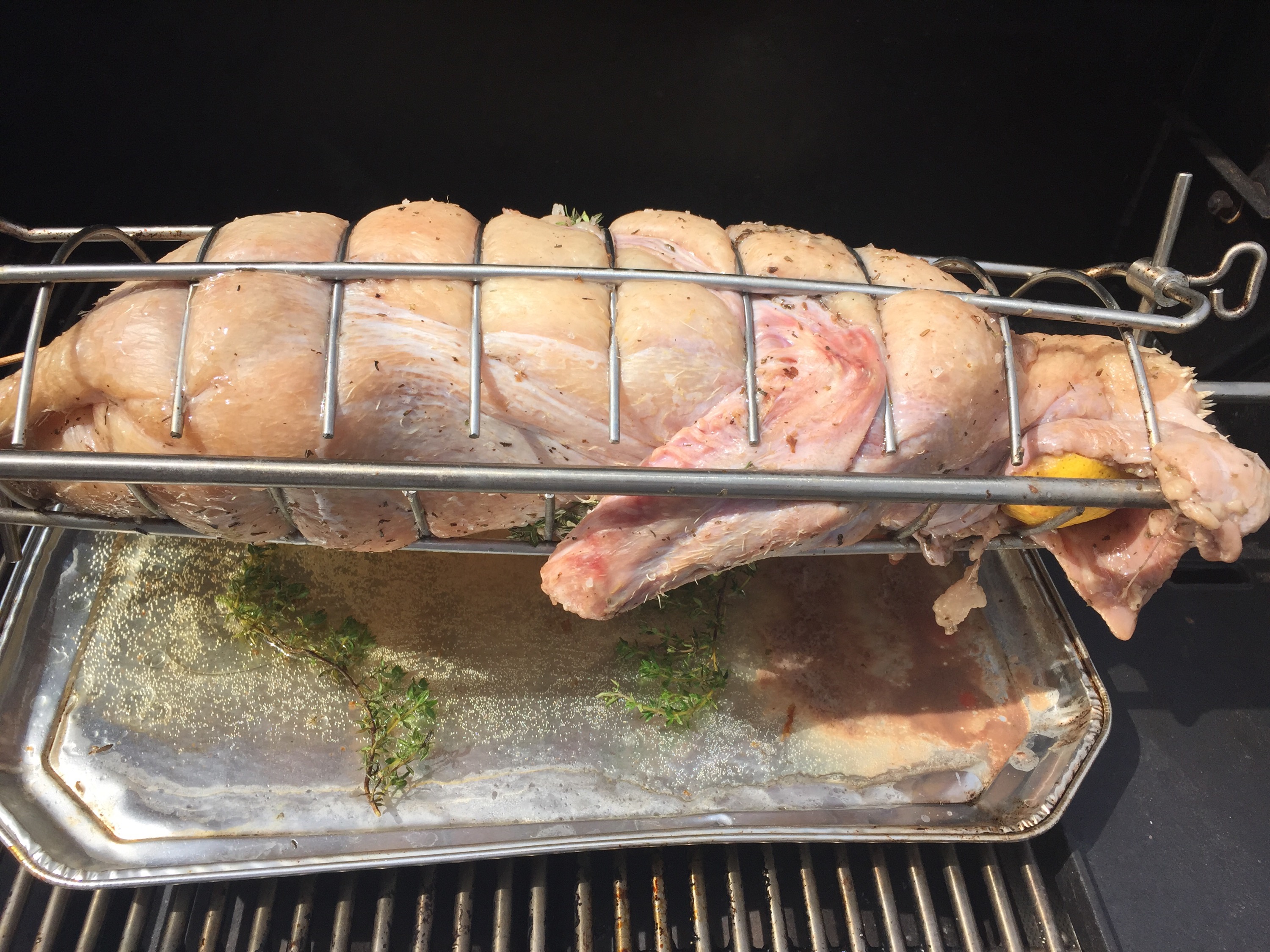 Die Ente wurde gut fixiert und der Spieß in den Grill gehängt und der Motor eingeschaltet! Eine Schale mit etwas Wasser darunter wo das Fett rein tropft!