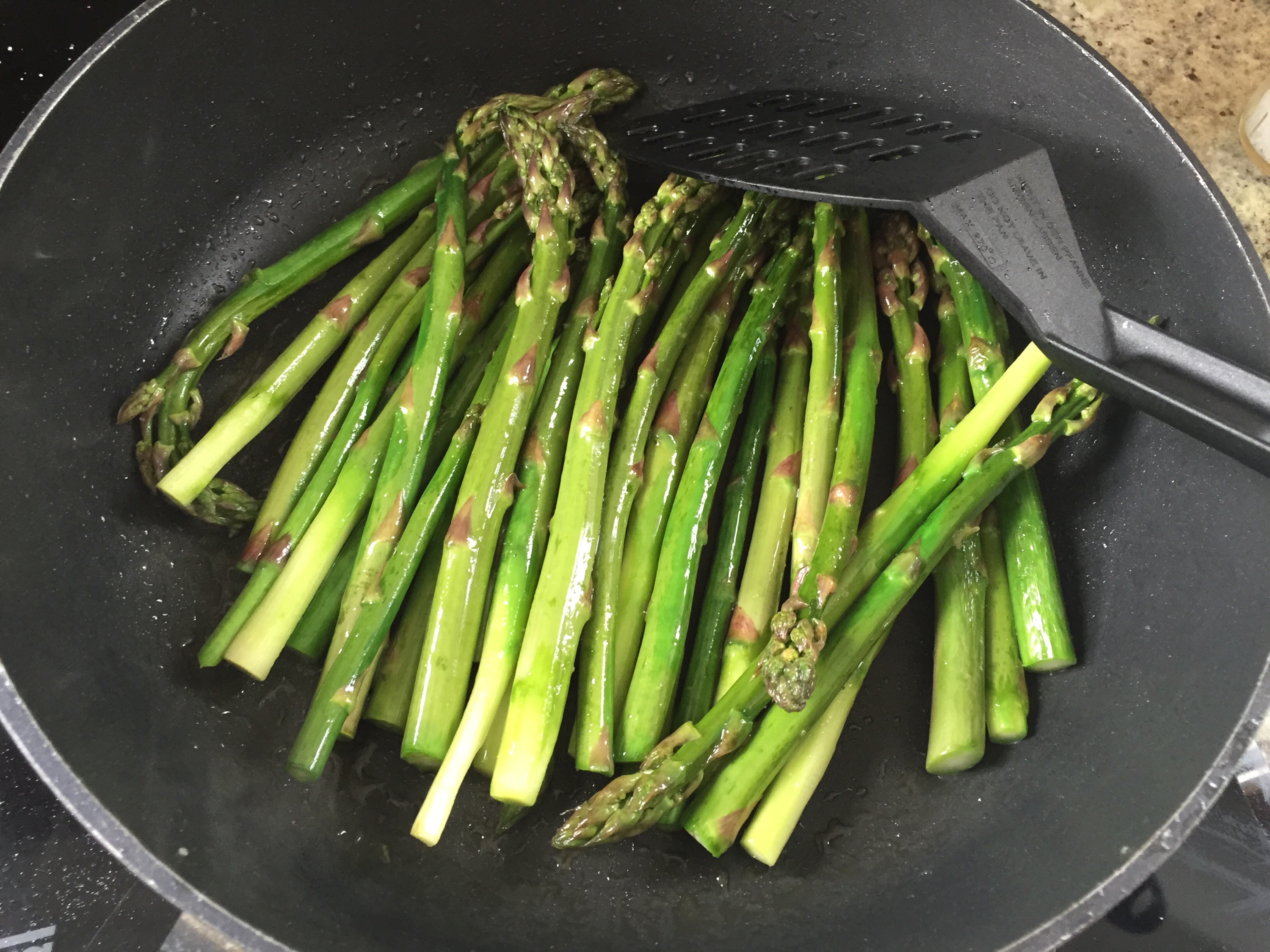 Jetzt den einfach nur im unteren Drittel geschälten Spargel in einer Pfanne in etwas Olivenöl knackig braten! Mit Salz würzen!
